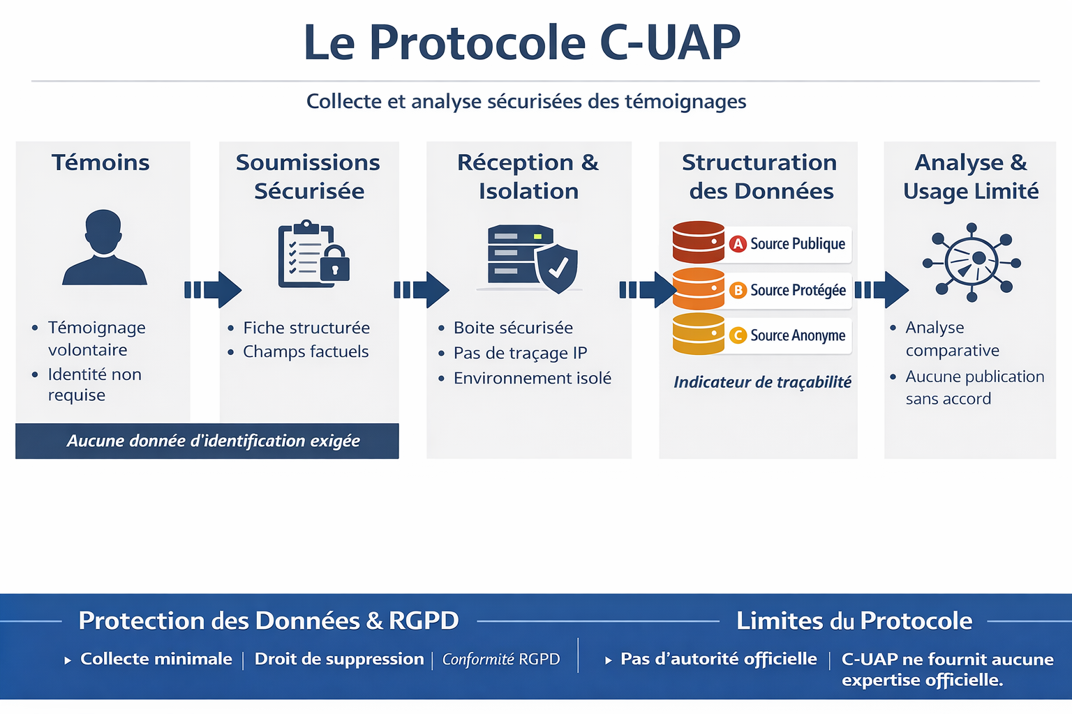 Cette page décrit de manière transparente et structurée la façon dont C-UAP collecte, traite, analyse et classe les témoignages relatifs aux phénomènes aériens non identifiés (UAP).